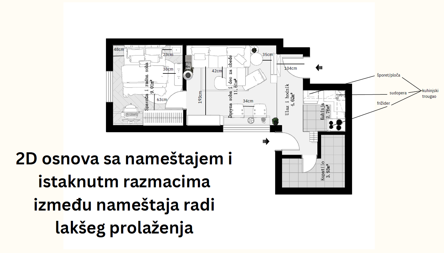 U Basic paketu dobijate glavne mere prostora, razmake (glavne) + dimenzije ključnih komada nameštaja (krevet, sofa, plakar) – sl. 1. Ovo je bitno ako tražite u salonu određeni komad, da ste upućeni u gabarite istog.