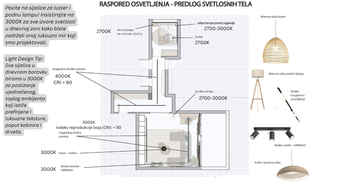 U Basic paketu dobijate raspored i pozicije osnovnog osvetljenja kroz 2D osnovu. Uz Plus doplatu, dobijate raspored osnovnog i slojevitog (radnog, dekorativnog, ambijentalnog) osvetljenja uz detaljnu specifikaciju – temperaturu (K), indeks reprodukcije boja (CRI) i predloge modela svetlosnih tela.