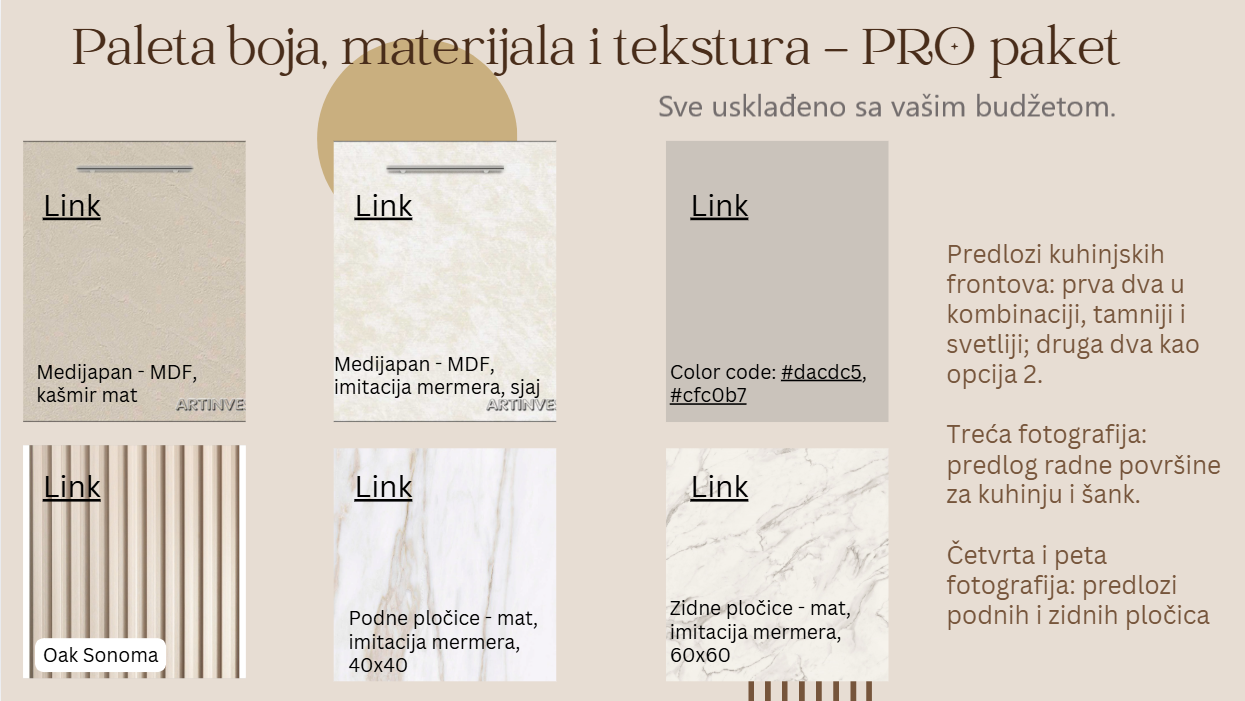 U Basic paketu dobijate palete boja, teksture i materijale u moodboardu, kako biste videli izgled celine i kao smernice šta da tražite prilikom kupovine. Uz Plus doplatu, dobijate linkove ka konkretnim materijalima, uz specifikacije materijala i kodove boja. Takođe, dobijate i finalni render prostora.