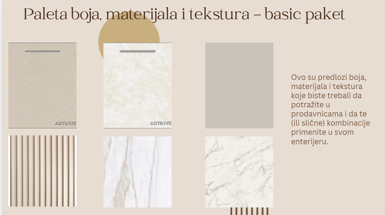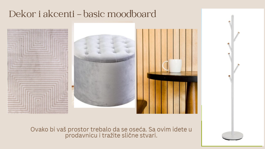 U Basic paketu dobijate moodboard sa prikazom dekora i akcenata koji treba da vam dočaraju stil i opšti utisak (sl.1). Ovo je bitno ako tražite u salonu određeni komad, da imate viziju šta vam je potrebno.