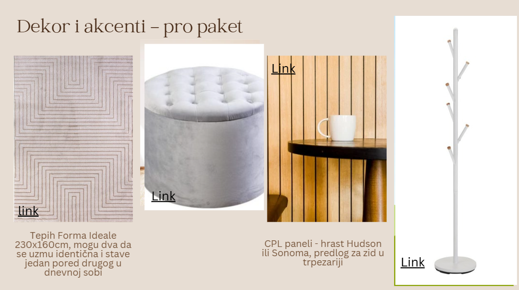 U PRO paketu dobijate ove predloge sa linkovima gde možete da ih nabavite i objašnjenjima materijala i zašto je baš taj komad predložen, odnosno kako se uklapa u vaš postojeći stil i enterijer. Takođe, deo PRO paketa je i render – fotorealistični prikaz prostora sa akcentom na dekore i fokalne tačke u ambijentu (sl. 2 i 3).