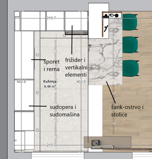 U PRO paketu dobijate sve iz Basic-a + detaljni razmaci (prolazi), visine kuhinjskih elemenata (gornji, donji, šank, vertikale) kao i mere za plakare, uz finalni render prostora (sl. 2-6).